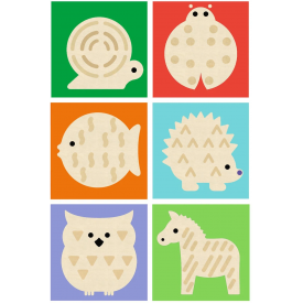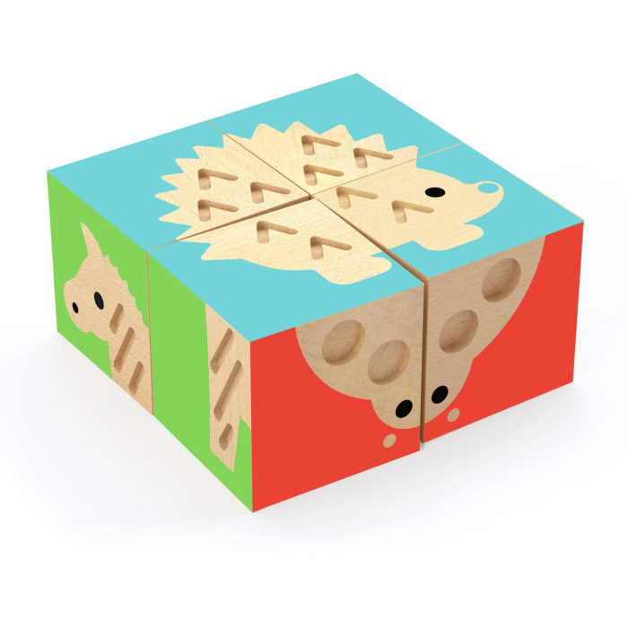 -Cuatro cubos de madera ilustrados y grabados con diferentes motivos para que el niño asocie lo visual con el tacto. Al combinar colores y motivos, el niño reconstruye 6 animales. -Cubos grandes fáciles de agarrar. -Los 6 animales tienen colores muy distintos para ayudar al niño a reconstruir fácilmente las imágenes. -Un motivo grabado para cada animal.